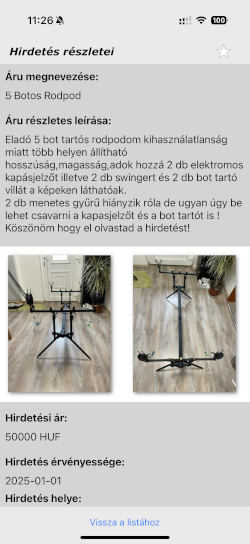 Egyéb lehetőségek: Üzenet küldés - A hirdetések részleteit megnyitva a felhasználóknak lehetőségük van üzenetet küldeni a hirdetőnek. Az üzenetekről a rendszer értesítést küld a felhasználó eszközére, illetve e-mailcímére. A nap végeztével az olvasatlan üzenetekről a rendszer mindaddig e-mail értesítést küld a felhasználónak, amíg az el nem olvassa az üzenetet. Értesítés kérés - A felhasználók előfizethetnek értesítés kérésre, ahol a rendszertől értesítést kérhetnek új hirdetés feltöltéséről, akár minden hirdetésről, akár megadott kategóriának megfelelő szűrt hirdetésekről szeretne a felhasználó értesítést kapni. Üzletkötések - Külön listán jelennek meg azok a hirdetések, ahol a hirdető eladott vagy a felhasználó megvásárolt egy terméket. Tiltások - A felhasználók letilthatnak más felhasználókat, a letiltott felhasználó hirdetései nem fognak megjelenni, illetve nem tud üzenetet küldeni Önnek. Hirdetés jelentése - A felhasználó jelenthet olyan hirdetést, amelyiket valamilyen okból véleményesnek tart. A hirdetés ezután megvizsgálásra kerül. Ha a probléma valós, a hirdetés tiltott marad, amíg a hirdető el nem hárítja a problémát okozó részt. |