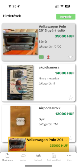 Hirdetés listák: A hirdetési listák 4 kategóriára osztva érhetőek el. Egyszerű hirdetések és árverések, keresés hirdetések, autó hirdetések és motor hirdetések listája. Minden lista lehetőséget ad keresésre, a listák szűrésére. Akár a kategóriákra szűkítés, vagy kulcsszóra való keresés lehetséges. A hirdetések a sorrendje minden esetben a legújabb hirdetéstől a legrégebben feladottig történik. Azonban lehetőség van a hirdetés előre sorolására. Az előre sorolt hirdetések esetén is az előre sorolt hirdetések sorrendje is időrendi. Egy ötödik lista a kedvencek listája, ahova az előző 4 listából a felhasználó jelölhet ki számára érdekes hirdetéseket. Ebben a listában mindaddig megjelennek a hirdetések, amíg a hirdetés él, tehát nem törölte a hirdetés feladója, vagy nem vásárolta meg azt egy másik felhasználó. |